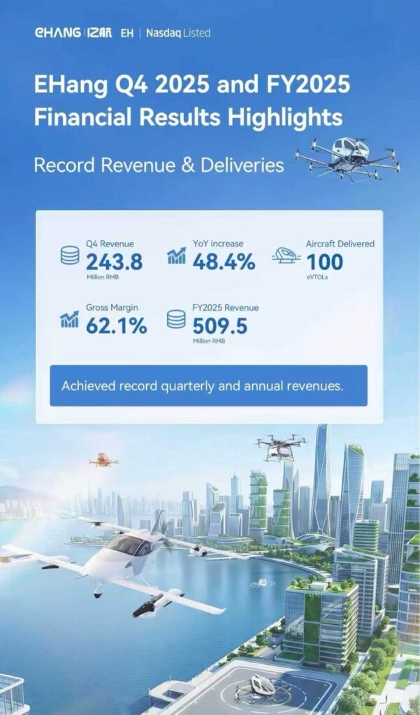 Autonomous air mobility company EHang announced its financial results for the fourth quarter of 2025 and fiscal year 2025, highlighting record revenue and significant progress in the commercialization of its eVTOL aircraft for passenger transport.